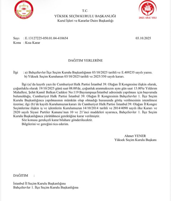 YSK’nın 03 Ekim 2025 tarihli ve 2025/350 sayılı kararında, CHP’nin kongre başvurusu detayları tek tek ele alındı.